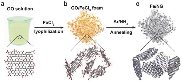 b) 由GO经冷冻干燥制得Fe/NG前驱体