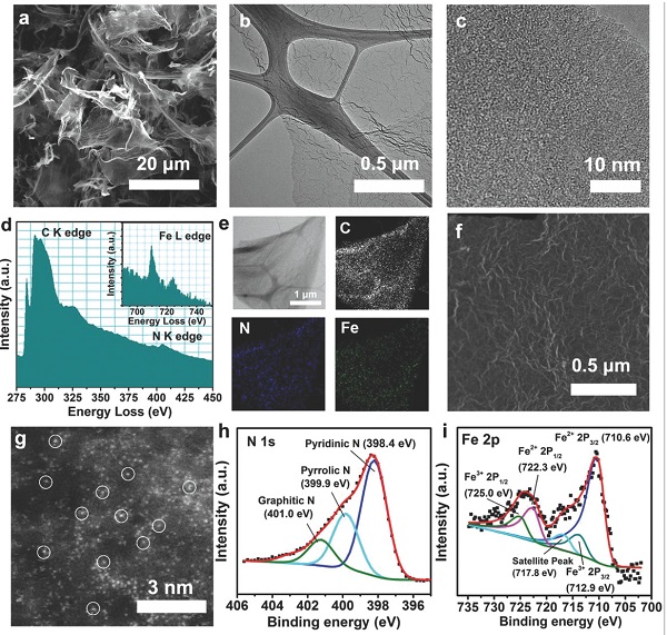 近日,江苏大学许晖教授、莱斯大学Pulickel M. Ajayan教授和James M. Tour教授(共同通讯)等人设计了氮掺杂石墨烯基Fe单原子催化剂(Fe/NG),在-0.6V vs.RHE时,产生CO的法拉第效率高达80%。通过球差校正电镜和X射线精细吸收谱表征,研究人员发现氮掺杂石墨烯存在氮原子限域的Fe单原子基团。此外,研究人员设计了一系列对照实验,证明了Fe单原子和掺杂氮原子对CO2电还原性能起到了关键作用。理论计算表明,在氮掺杂石墨烯中引入痕量Fe原子能够形成Fe-N4位点,促进CO2的吸附和活化。该Fe/NG催化剂为探究催化活性中心在电催化中的作用提供了理想平台。相关成果以题为“Electrochemical CO2 Reduction with Atomic Iron-Dispersed on Nitrogen-Doped Graphene”发表在Advanced Energy Materials上。