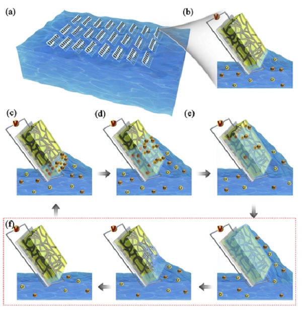研究人员利用电动理论制备的薄膜型海洋波浪能转换器件实现了对各种频率波浪能的直接转化;通过对实验参数的调整,获得了最大电压11.14mV和最大电流3.00μA的脉冲电信号,并探讨了不同冲刷频率、水温和器件倾斜角对电信号的影响;通过多个器件的串并联实现了电信号输出的成倍增加,对器件在真实环境中的应用有重要意义。