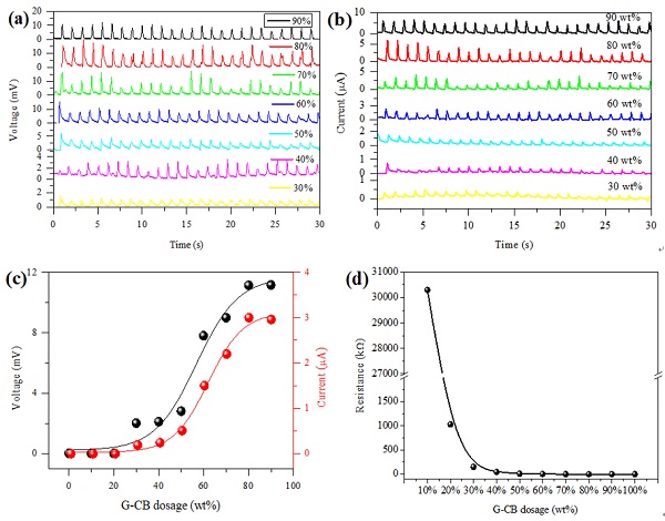 (c)炭黑-石墨烯含量与器件电流、电压输出的关系图;