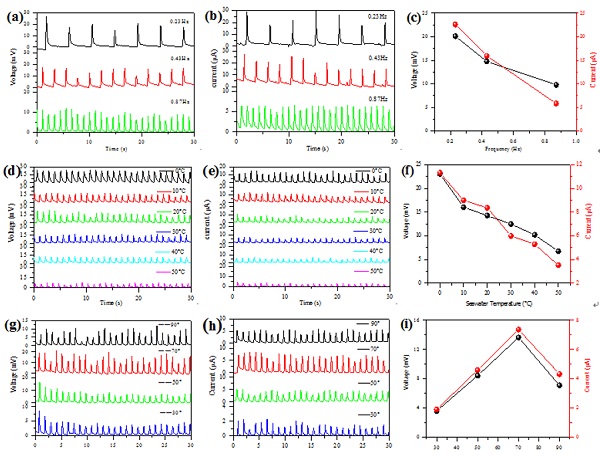 (g, h, i)器件在不同放置倾斜角下的电信号输出。