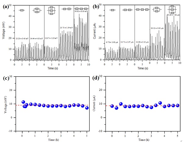 (a, b)不同炭黑-石墨烯含量波浪能转化器件的电压、电流输出;