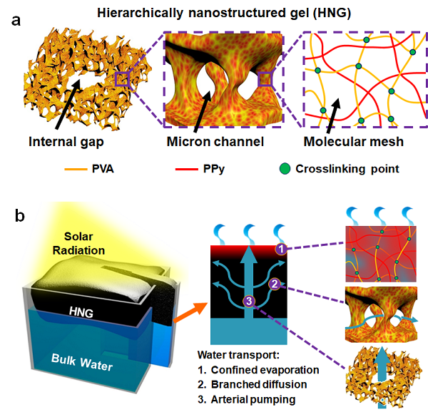 如图1所示,这种多级纳米结构水凝胶由相互贯穿的聚乙烯醇(PVA)和聚吡咯(PPy)构成。其中,聚乙烯醇分子链交联成三维网络结构形成凝胶骨架。该骨架借助冷冻-融化循环处理引发的物理交联效应进一步形成微孔结构。同时,聚吡咯分子团在聚乙烯醇物理交联过程中起到模板作用。因此,不同于纯聚乙烯醇凝胶,该复合凝胶内部形成了更大尺寸的通道。这种三级多孔结构有利于加快水分的蒸发。 除此以外,由聚乙烯醇分子链形成分子网络可将水分子限制在分子网格内,避免水对流引起的热损失。微孔结构遍布于胶体内部,确保了水分均匀分布。而内部的大尺寸通道可借助毛细效应有效的将水分从底部水体输运到蒸发表面,以实现持续的水蒸发。尤其值得注意的是,研究者发现,具有特定高分子/水比例的水凝胶可以加速水的挥发。进一步研究表明,这种促进作用来源于亲水高分子链和水分子的相互作用。这种相互作用可以有效降低水的相变焓,提高蒸发速率。(即水由液态变为气态所需要的能量)。