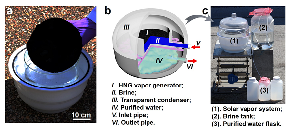 为了探索这种新材料在实际环境下工作的能力以及揭示其潜在的应用价值。研究团队模仿现行的家用太阳能海水淡化设备制作了凝胶海水淡化器模型。利用最廉价的塑料容器和管路,搭建了可直接利用自然光淡化海水的装置。实验结果证明,在没有任何聚光设备和真空装置辅助的情况下,该系统中每平米的复合水凝胶一天可生产18至25升高质量淡水,基本能满足一个家庭的饮用需要。