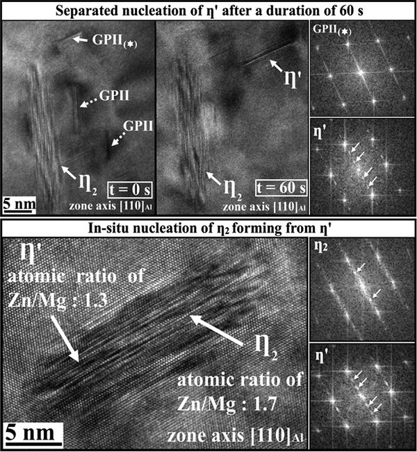 AA7050 Al-Zn-Mg-Cu合金因其重量轻,强度高而广泛应用于航空航天工业。其机械性能主要取决于纳米尺度的析出物,之前已经探索了相应的沉淀硬化模型。 过饱和固溶体→GP区→η’析出物→η析出物的沉淀序列是众所周知的。然而,GP区→η’和η’→η沉淀物的精确转变机制尚未阐明。近日,台湾大学Jer-Ren Yang和Yo-LunYang(共同通讯作者)等人通过利用高分辨透射电子显微镜(HRTEM)和纳米尺度能量色散X射线(EDX)研究了Al-Zn-Mg-Cu合金AA区域中的GP区→η’→η析出序列的转变机制,连续的原位HRTEM帧显示在相邻的GPII区溶解时,η’沉淀物的分离成核发生在别处。系统地阐述了成核机理及原位转变。