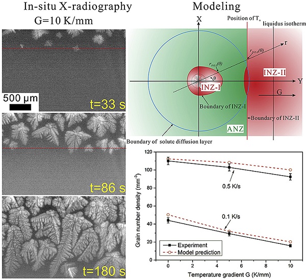 通过孕育处理的晶粒细化是降低热撕裂敏感性并改善铝铸件结构均匀性和力学性能的重要技术。近几十年来,接种的细化机理以及不同因素对晶粒细化性能的影响得到了广泛的研究。近日,挪威HTH官网地址 大学Yan jun Li(通讯作者)等人通过原位X射线照相固化研究,实现了对定向凝固过程中非均匀成核和晶粒长大的分离温度梯度效应和冷却速率效应的定量研究。提出一种物理模型来定量说明温度梯度对生长晶粒周围熔体中晶粒异质形核的影响。此外,还预测本实验模型对于其他晶粒生长及环境应用。