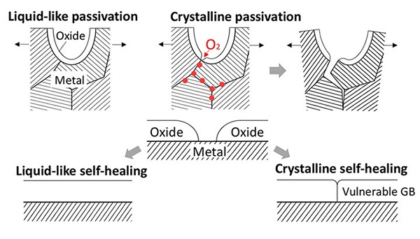 氧化铝和二氧化硅是用于钝化的特殊氧化物,因为它们在空气中以几纳米厚度的玻璃态存在,及有助于阻止氧化的发生。这些表面玻璃在氧化环境中的机械行为及其初始形成对于理解不仅应力腐蚀开裂,而且有助于薄膜生长和纳米玻璃动力学的研究。近来,中佛罗里达大学Akihiro Kushima等人(通讯作者)等人在O2气体环境下,通过使用原位透射电子显微镜(TEM)对纯铝纳米纤维拉伸进行研究。研究发现,氧化铝像液体一样变形,并且可以匹配Al的变形,在适度的应变率下没有任何裂缝/裂纹,并以原子分辨率观察氧化铝的自愈过程。在铝上发现氧化铝薄膜的无缝生长有益于探索更好地控制气相沉积薄膜和纳米玻璃中的界面。同时,原位技术将ETEM与纳米级培养基固定器结合起来,被证明是研究SCC和金属初始氧化的有力工具,可以在原子分辨率下观察化学和/或机械诱导的相变。