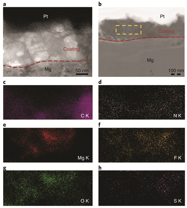 目前,锂离子电池的能量密度研究,已经接近理论研究的极限。因此开发新型的二次电池,提高电池的能量密度就变得尤为重要。金属镁离子电池,具有高于锂离子电池的体积容量,高达3832 mAh·cm-3,这几乎是锂离子电池的两倍。这种高的理论值为镁离子电池,提供了能源领域的大范围应用潜能。同时,在固态电解质或者高腐蚀性和氧化不稳定的电解质中,镁的沉积/剥离具有化学可逆性,可以提供一个很宽的电压窗口。但是其动力学性能较弱。因此,本文报道了一种合成的Mg+2导电界面。它可以在镁正极表面形成,同时为镁的沉积/剥离提供可逆性。更重要的是它具有低的电导率,可以防止电解液的化学还原,提高碳酸盐电解液的抗氧化性。