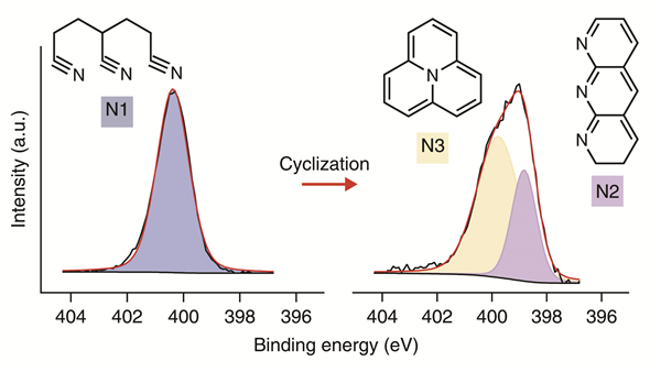 Mg+2离子的导电界面的中N元素环化前后的XPS图。