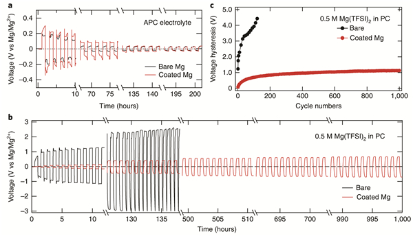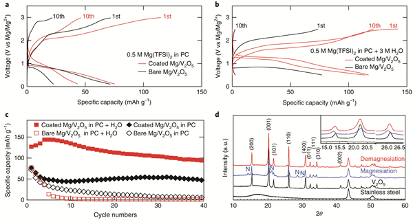 (a)在0.5 M Mg(TFSI)2/PC电解液中,含有和不包含镁薄膜包覆正极的全电池的充放电曲线;