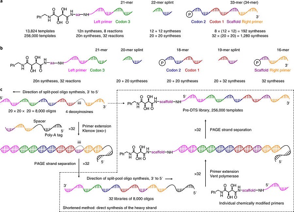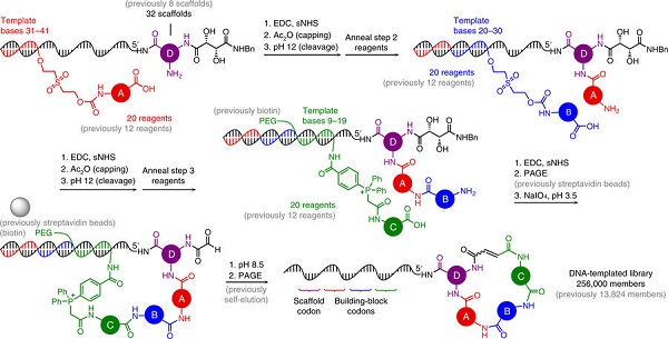 图1:DNA模板的大环化合物文库合成示意图