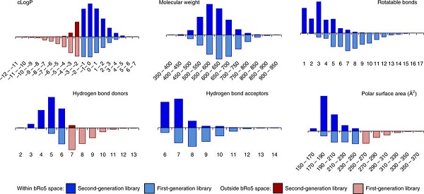 来自第二代大环文库的物理参数显示在x轴的上方,而来自第一代文库的物理参数显示在x轴的下方。 颜色表示在参考文献中所描述的理想的“beyond rule of five”(bRo5)参数范围内部(蓝色)或外部(红色)的值。