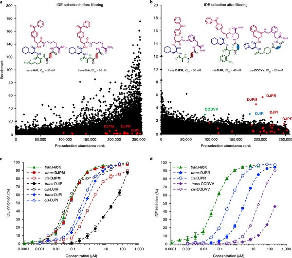 (6)最后,通过针对IDE的体外选择验证了新的文库合成方案,导致发现对先前优化的IDE抑制剂6bK(IC50 = 50nM)等效的大环trans DJPM,并且发现cis-DJIR(IC50 = 40 nM),这是一种意想不到的IDE顺式大环骨架配体IDE抑制剂,代表了一种新型的结合IDE的大环化合物。