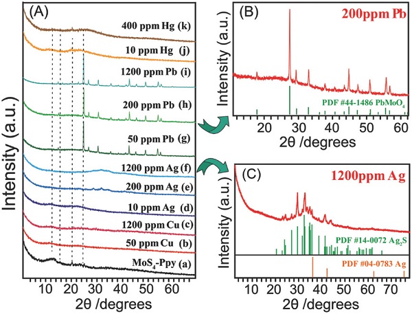 图7 MoS4-Ppy在吸收不同浓度Cu2+, Ag+, Pb2+和Hg2+前后的XRD谱图