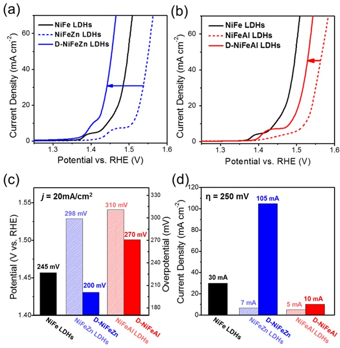研究人员通过对NiFeZn和NiFeAl LDHs进行选择性刻蚀,在NiFe LDHs层板上分别引入M(II)和M(III)缺陷,从而获得了具有优异性能的缺陷类电催化材料。富含M(II)缺陷的D-NiFeZn LDHs暴露了Ni-O-Fe活性位,具有优异的OER电催化性能,在20 mA cm-2电流密度下过电位仅为200mV,这也是目前报道的性能最优的NiFe基OER催化剂。该工作不仅为探究NiFe基材料的OER活性位点提供了新的思路,也为控制合成高效电催化剂提供了有力借鉴。