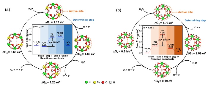 b)含有M(III)缺陷位的NiFe LDHs 结构OER机制理论计算