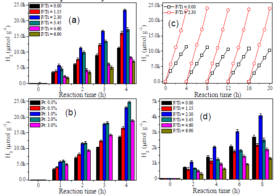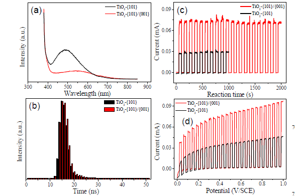 (a-c)含和(d)不含Pt助催化剂的不同的{101}/{001}暴露比例的小面结合工程TiO2 SCs上的光催化水分解