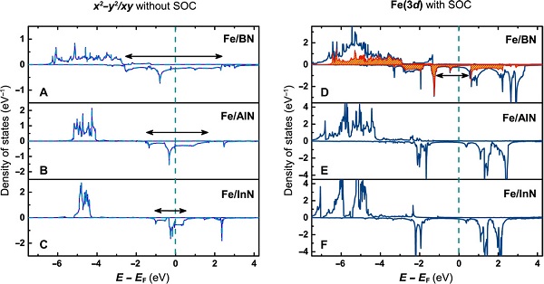 图3:BN,AlN和InN上的1ML Fe电子结构