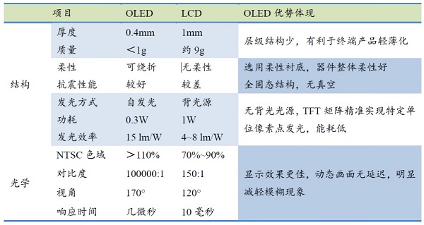 近些年来,OLED 在发光效率和发光亮度上有了大幅提高,开启电压不断降低,光谱的稳定性和器件的寿命也有了很大的进步。与传统的LCD技术相比,其在画质、功耗、物理形态和功能上均有着明显优势。