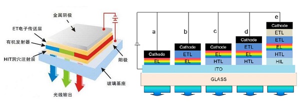 OLED的结构一般由阳极、有机功能层和金属阴极组成。阳极材料一般为氧化铟锡(ITO),它是附着在玻璃上的一层透明导电层,作为器件的一个电极,其透光性好,允许光从中穿透射出。有机层一般是通过真空镀膜或旋转涂层的方法得到的一层或多层的的有机膜层,有机层的另一侧为阴极,大都是由金属组成。经过多年的发展,器件的结构也由最初的单层器件,逐步发展为双层,三层,多层,乃至现在的叠成器件,如图。一般包括空穴注入层(HIL),空穴传输层(HTL),发光层(EL),电子传输层(ETL)和电子注入层(ETL),在一些结构中还在发光层的一侧加入阻挡层,即空穴阻挡层(HBL)或电子阻挡层(EBL)。在实际的应用器件中,考虑到不同的结构(例如顶发射或者底发射),不同的材料属性(例如荧光或者磷光)器件制作者一般都会设计相应的特殊结构和不同的功能层来提高器件的效能。