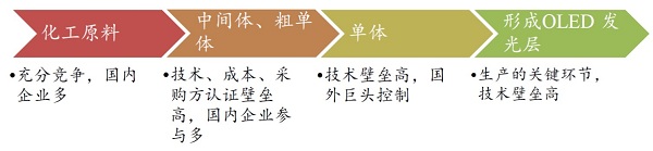 发光材料的生产涉及分子结构设计、材料合成及纯化等一系列过程,其流程可简化为如下:首先,材料厂商将化工原料合成为OLED中间体和单体粗品,再进一步合成为升华前材料,并将其销售给OLED终端材料厂,由OLED终端厂商进行升华处理最终形成OLED终端材料用于OLED面板的生产。