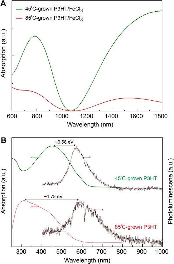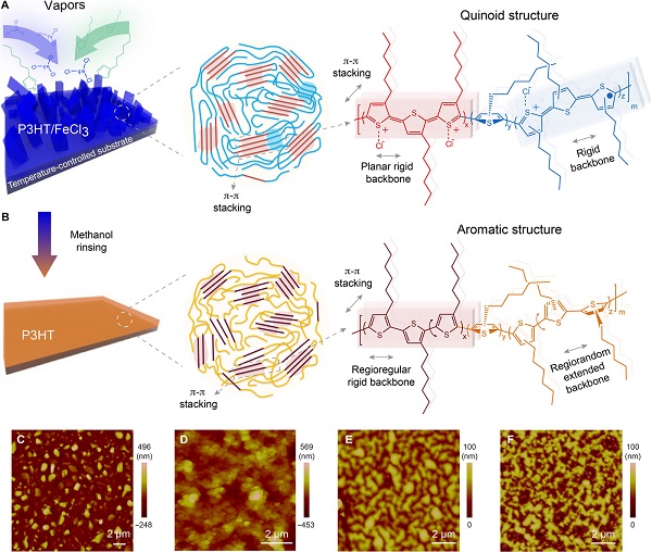 在这个工作中,作者通过氧化化学沉积的方式,利用高分子链中碳碳双键的强键合作用和聚合物链间非共价的π-π相互作用,获得了高热导率的聚合物薄膜。该聚合物薄膜的热导系数为2.2 W/m·K, 比传统聚合物的热导率高10倍。首次实现了利用共轭聚合物薄膜实现了高热导率。