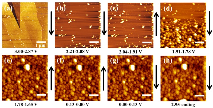 图2. 原位原子力显微镜下观察到的化成过程中石墨(HOPG)表面SEI膜的成膜变化过程(电解液组成为0.1 M LiBOB + 0.9 M LiPF6 (EC/DMC=1:1))。黑色箭头代表AFM扫描方向。