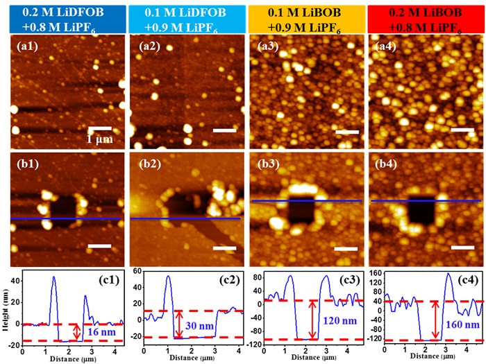 本文主要利用电化学原子力显微镜研究了两种不同电解液在化成过程中SEI膜的结构演变过程,实现了锂离子电池化成过程的实时可视化监控,有望为锂电行业电解液筛选及化成工艺的优化提供宝贵的借鉴指导。
