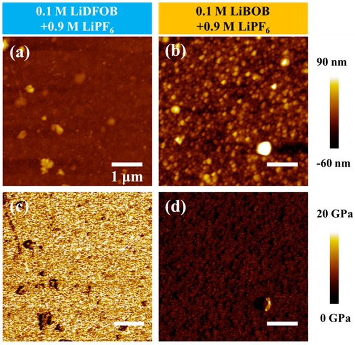 图4. 0.1MLiDFOB+0.9MLiPF6所组成的电解液所形成的SEI膜的杨氏模量数值与0.1MLiBOB+0.9MLiPF6所组成的电解液所形成的SEI膜的杨氏模量数值