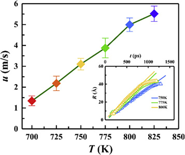 上图是晶核生长速率与温度的关系曲线,插图中展示了三个代表性温度下,晶核等效半径随时间的变化,插图中实线表示斜率u = dR/dt。