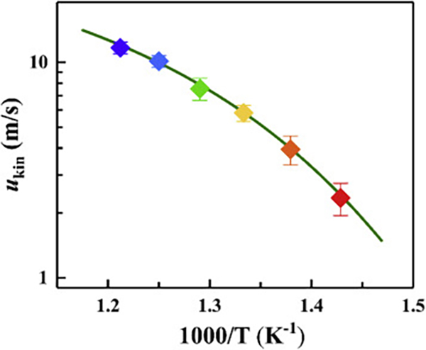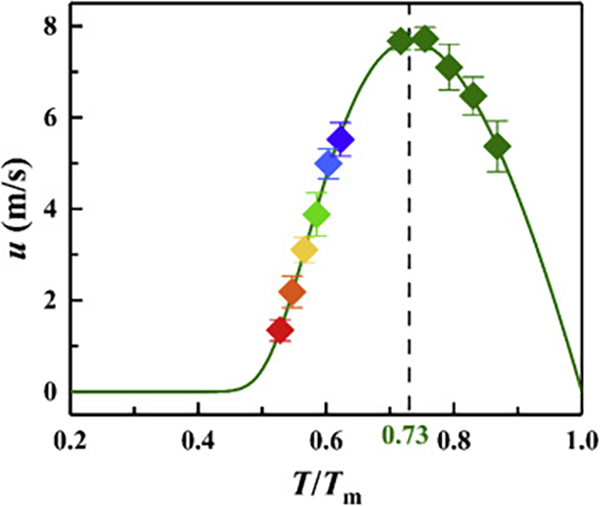 图中实线是展示了理论估算的生长速率,图中的菱形展示了不同过冷度下的模拟得到生长速率。理论值和模拟值基本重合,表明理论预测的可靠性。