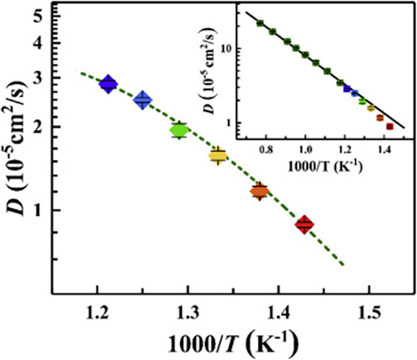 图中实线由方程拟合得出,由此看出没有随温度线性变化,表现出很强的non-Arrhenius行为。