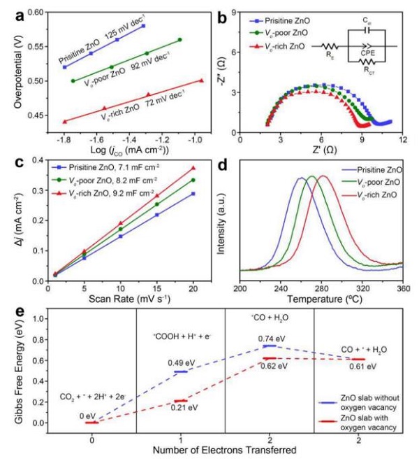总之,在DFT计算的指导下,研究人员采用简单的H2等离子体刻蚀的方法开发了富含氧空位的ZnO纳米片作为高效的CO2电化学还原催化剂。 在CO2电化学还原过程中,富含氧空位的ZnO纳米片在- 1.1 V vs RHE的电压下,CO2被有效还原成CO产物的电流密度高达- 16.1 mA/cm2,同时其法拉第效率高达83%左右。机理研究进一步表明,二维薄层ZnO表面的氧缺陷结构可以有效地提高CO2的活化作用,从而提高ZnO催化剂对CO2电化学催化还原反应的性能。这项工作将为合理设计新型催化剂,通过调节催化剂的电子性质来实现CO2电化学还原提供指导。