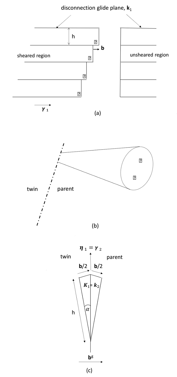 II型孪生的拓扑模型用k1滑移面产生的位错(b,h)表示。如果这些缺陷在平面上具有足够大的运动能力,I型孪生会在K1=k1时以简单剪切的方式形成,然而,如果缺陷的运动能力受限而发生聚集,在后续的调节弛豫时,K1=k2产成II型孪生,形成和长大机制与I型不同,需要剪切分割和相邻晶体的相对旋转。拓扑模型符合经典模型中对I型孪生的描述。然而,对于II型孪生的机制,拓扑模型扩展了经典模型中的两个扭曲形变,将旋转分裂补充至经典模型的简单剪切中。