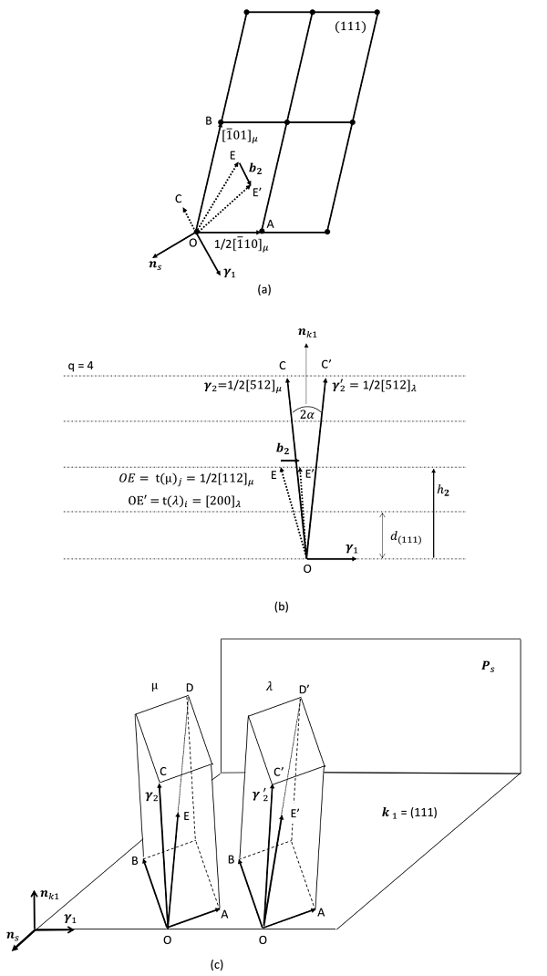 (b)剪切的(001)面上沿ns投影方向,表示位错参数(b1,h1)。