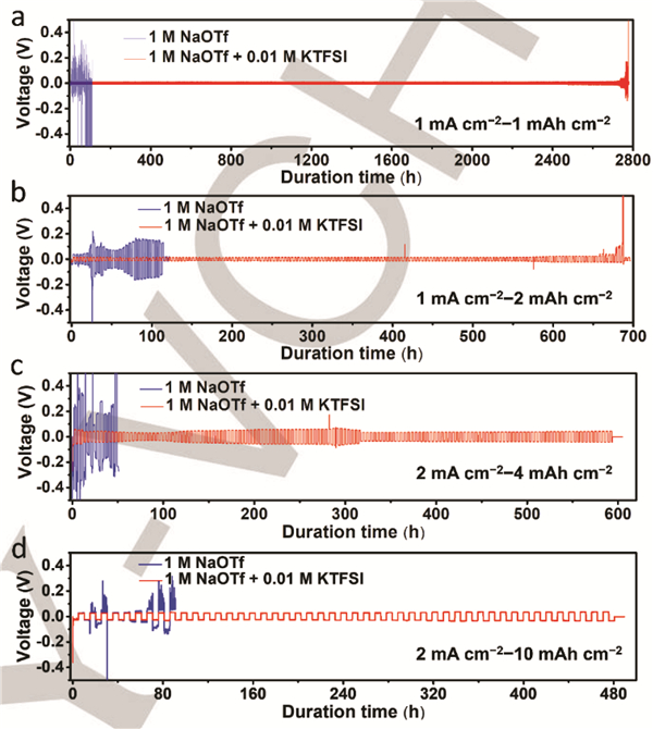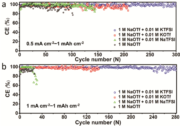 本文发现了一种双功能电解液添加剂KTFSI,它能显著提高钠离子电池的效率、循环寿命和循环容量。添加的K+正离子能够提供静电屏蔽作用,抑制钠枝晶的生长;TFSI–负离子有助于含氮SEI膜的形成。因此,实验中由于KTFSI的添加,钠离子电极材料能够在10 mAh cm-2的高容量下,持续充放电超过400小时。