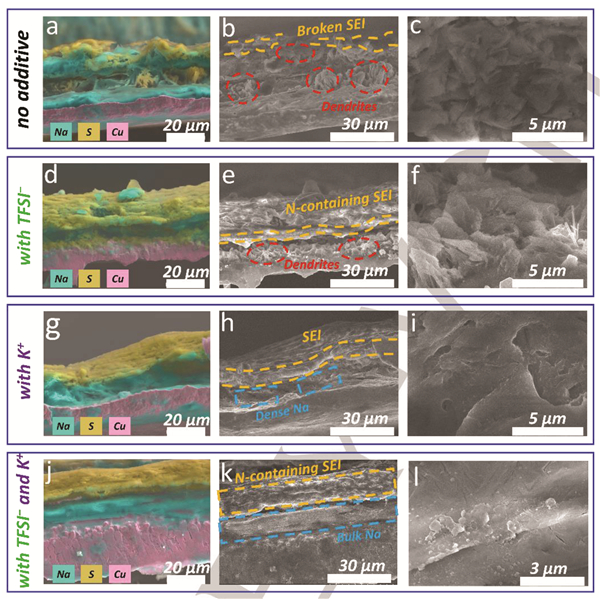 (c,f,i,l)钠金属层截面的放大SEM图。