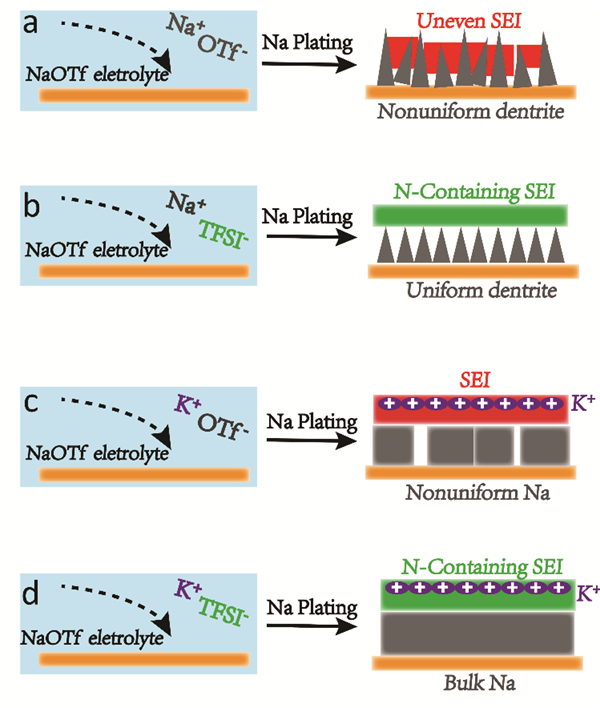 (b)添加TFSI–的NaOTf电解液,含氮SEI膜下钠的均匀沉积示意图;