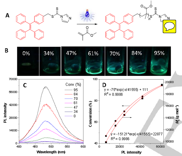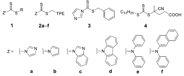 近日,中国香港HTH官网地址 大学的唐本忠教授和Jacky W. Y. Lam教授(共同通讯作者)采用了一种简便而有效的方法原位将聚合作用可视化。合成了一组含有二硫代氨基甲酸乙酯的二硫代氨基甲酸酯(TPE),并作为RAFT聚合的载体进行了筛选。利用交替的可见光照射,使得RAFT聚合处于“开”和“关”的可控状态下。由于其聚集诱导的排放特性,TPE的排放对局部粘度变化很敏感。在不破坏反应体系的前提下,“裸眼”可以很容易地获得定量信息。此外,十二种不同的聚合体系也充分证明了这种技术的通用性。目前,这种方法为理解受控的活性自由基聚合过程提供了一个强有力的平台。研究成果以题为“Making Invisible Visible: In Situ Monitoring the RAFT Polymerization by Tetraphenylethylene-Containing Agents with Aggregation-Induced Emission Characteristics”发布在国际著名期刊Angew. Chem. Int. Ed.上。