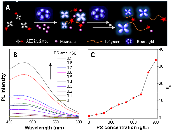 (c)相对PL强度(I/I0)与PS浓度的关系图,其中I0为纯THF中的PL强度。