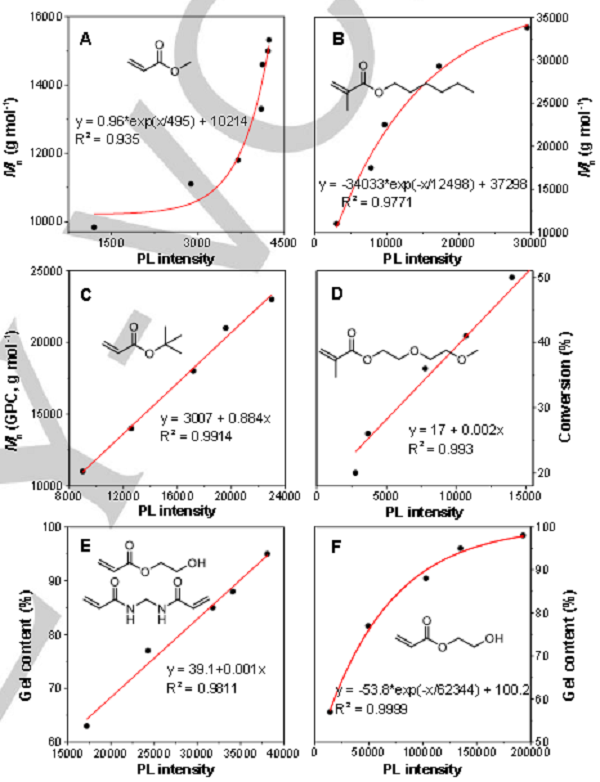 研究通过光化学和AIE技术相结合的方法,证明了在原位可视化聚合过程的方法。与物理共混或ACQ系统相比,化学粘接法检测了聚合物段和周围环境的粘度变化,使其具有较高的灵敏度和准确性。并且,十二种不同单体的聚合,包括更少的steric,体积大的,NMR难以测定的,功能的和双功能的,都是基于单体转换或凝胶含量与PL强度的具体关系进行了良好的监测。这种新兴的方法为研究聚合过程提供了一个强大的平台。