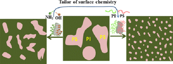 由于皮克林效应和两侧不同润湿性的共存,Janus颗粒有望在液/液界面自组装。近日,青岛HTH官网地址 大学的贺爱华教授(通讯作者)等人合成了Janus纳米片并评估了其通过界面自组装捕获非平衡形态的能力。 Janus纳米片通过在二氧化硅纳米片的两侧选择性接枝聚合物链——聚苯乙烯(PS)或聚异戊二烯(PI)而合成。选择性接枝法赋予纳米片两种不同的可湿性,使其成为PS / PI界面自组装的理想选择。纳米片的界面干扰在聚合物共混物的相分离过程中捕获了中间非平衡形态。与其他Janus材料相比,由于其二维结构,Janus纳米片具有更高的界面活性并且更有效地降低了系统的自由能。仅需要2 wt%的Janus纳米片就可以打破阈值并达到阻塞状态。 Janus纳米片容易放大并且在聚合物材料中具有作为增容剂的潜力。