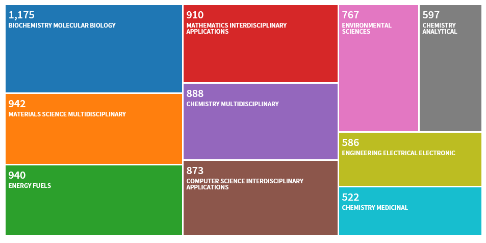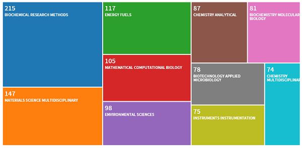 注:由于数据库中有很多重叠部分,比如说有些文章是有关材料化学的但是文章题目没有体现,web of science在分类时会把它分到计算机相关方向,这样也就造成了数据存在不准确性,而我们仍然统计只是说明材料化学领域人工智能相关研究一直处于上升阶段,也为了更直观的表达,所以读者朋友们对数据有不同看法的可以和我们联系,我们一定认真聆听教诲!