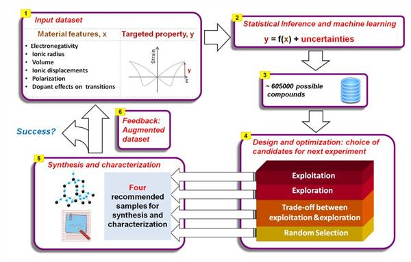国内关于这方面的研究也在不断进入白热化阶段,前不久西安交大孙军教授、丁向东教授团队提出了一个基于机器学习技术的材料设计方法,并应用于加速设计开发新型压电材料。这一设计思路是一个由数据采集、统计模型、实验设计、结果反馈组成的循环回路;通过对回路的多次循环,实现对材料目标性能的快速优化。区别于以往以预测结果为导向的实验设计,上述循环最大的不同之处在于利用预测结果的不确定性(uncertainty)进行实验设计,仅仅通过三组实验就成功开发了一种具有高电致应变的无铅压电材料。同时,本文还比较了不同的实验设计策略,发现平衡考虑预测值与不确定性的策略在材料开发中更加高效。(Accelerated Discovery of Large Electrostrains in BaTiO3-Based Piezoelectrics Using Active Learning,DOI: 10.1002/adma.201702884)