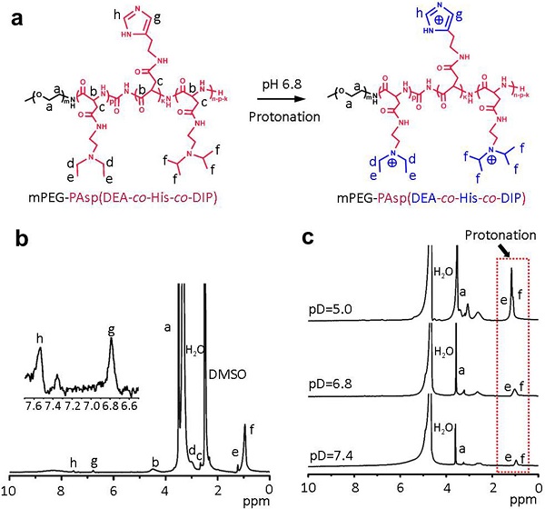 (c) D2O溶液中mPEG-PAsp(DEA-co-His-co-DIP)在不同pD下的1H NMR谱对比图。