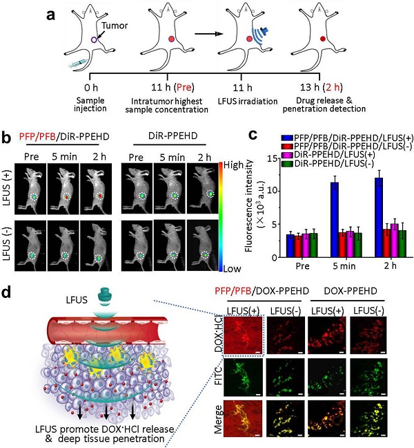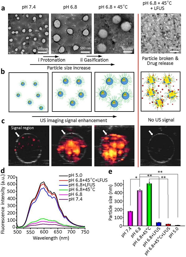 研究了一种PH敏感的聚合体来包裹液体PFC和DOX,形成一个178 nm的纳米粒子,它可以通过EPR效应有效的进入肿瘤,然后在进入酸性肿瘤微环境扩展的437 nm。同时,利用皮下C6胶质瘤异种移植模型,证明了这种纳米颗粒具有通过EPR效应维持长时间循环和肿瘤积累的纳米尺寸的能力。在肿瘤微酸环境(PH=6.8),这种纳米颗粒自我膨胀,通过红外线或低频超声,在局部加热的情况下,被囊化的碳氟化合物发生了与温度有关的相变,进入气体,超声成像可检测到回声的显著增加。在肿瘤部位的低频超声照射,使得DOX快速释放和肿瘤吸收,有更好的肿瘤治疗效果。此外,低频超声(LFUS)协助释放显示了肿瘤穿透药物扩散,克服了纳米载体可能无法有效的将药物输送到远离血管的肿瘤组织的挑战。