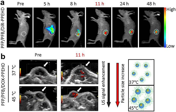 (b)在37oC和45oC时,以肿瘤为中心的能量多普勒超声对动物的尾静脉注射PFP/PFB/DOX-PPEHD纳米颗粒。