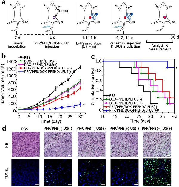 (a) PFP/PFB/DOX-PPEHD和低频超声(LFUS)联合治疗抑制肿瘤生长的示意图;