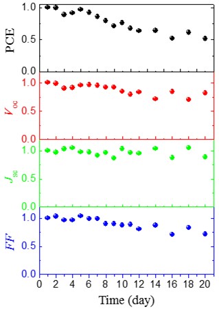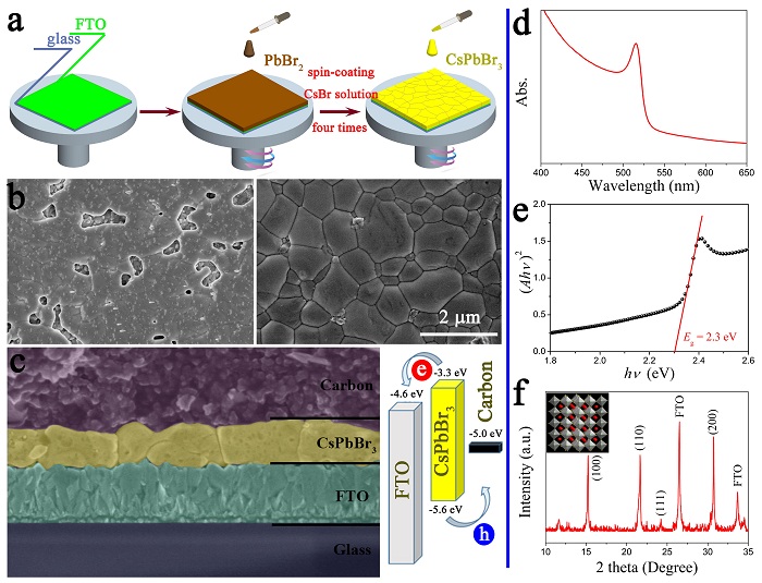 钙钛矿太阳能电池由于具有较高的光电转换效率(> 22.7%),被研究人员认为是近年来最有希望解决能源问题的途径之一。然而,传统有机-无机杂化钙钛矿吸光材料的稳定性却成为其商业化的最大障碍。为此,研究人员尝试开发新型的钙钛矿结构吸光剂。其中,具有钙钛矿结构的CsPbBr3表现出非常优异的光学、热学和化学稳定性,是一种较为理想的电池材料,目前已通过技术优化、界面优化等方式将电池效率提升至13%以上。但该类电池仍存在一定的问题:首先,传统的二氧化钛电子传输层不仅需要较高的煅烧温度,不利于柔性器件的制备,而且在紫外光照射条件下会对钙钛矿材料具有严重的降解作用;其次,目前常用的空穴传输层中吸湿性添加剂的存在也会降低电池的稳定,增加生产成本,不利用电池的商业化进程。因此,如何改善CsPbBr3无机钙钛矿太阳能电池的制备过程,降低制备温度以及生产成本是目前急需解决的问题之一。