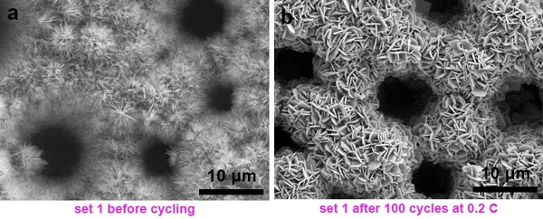 图4 Ni/Porous-Ni/V2O5复合电极材料在100次充放电循环前后的形貌对比